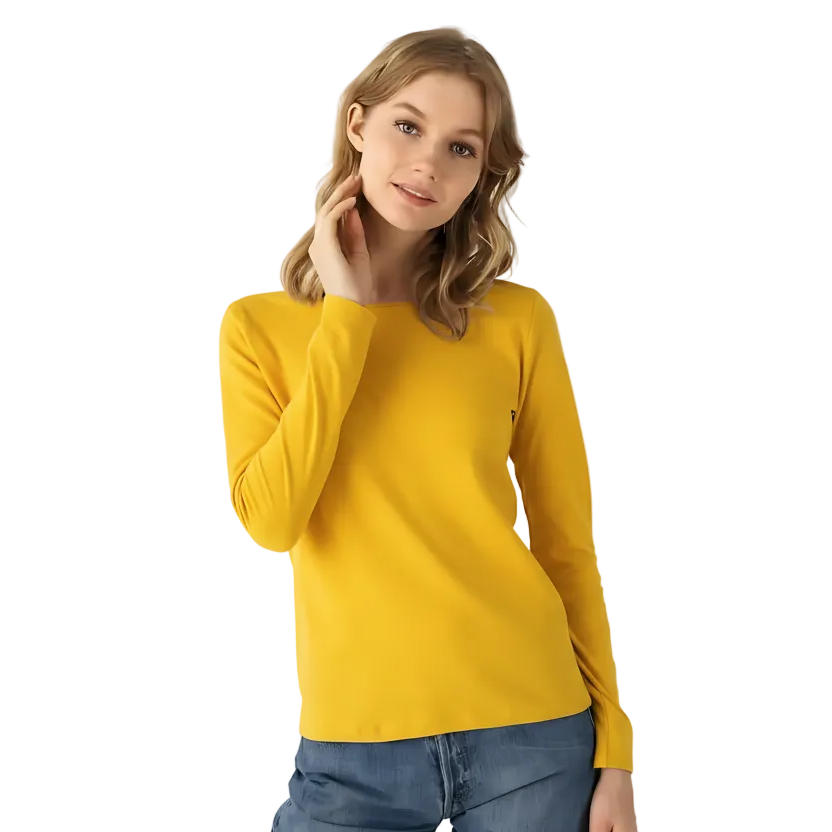100% cotone ring-spun preristretto. T-shirt a manica lunga da donna, struttura con cuciture laterali, collo a costina sottile, etichetta satinata, leggermente sfiancata, superficie ideale per la stampa. Col. SG620: 85% cot. 15% vis.